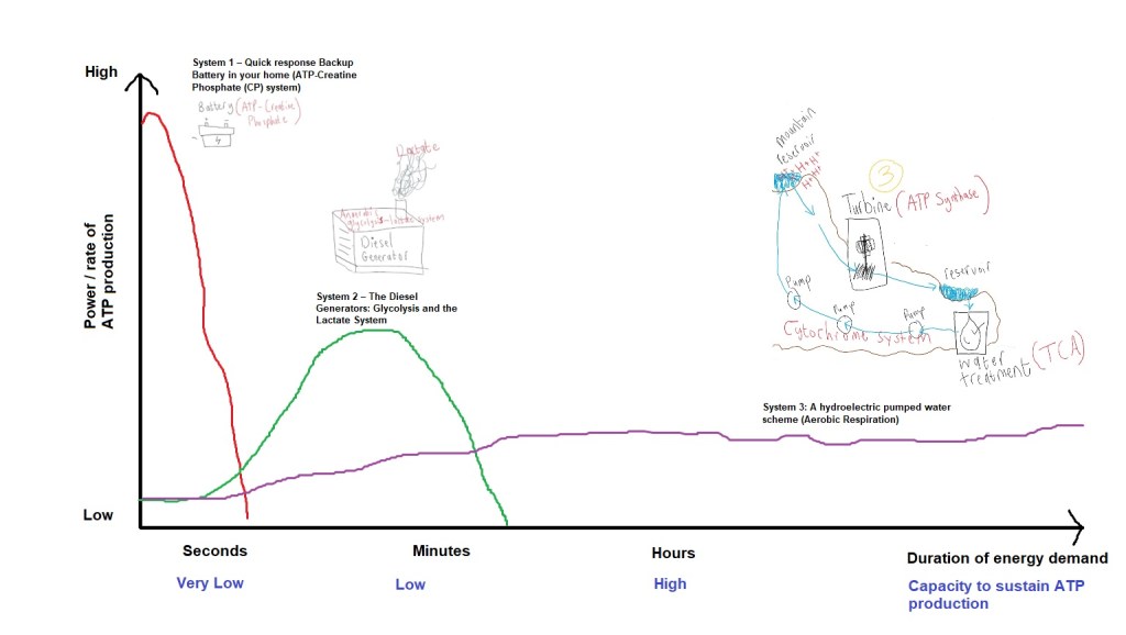 - Diesel generator (Anaerobic respiration / Glycolysis / Lactate system) which produce energy during times of high demand but comes at a cost, that beautiful humming sound heard all over the country. This system provides a bridge between the depleted batteries and the more sustainable long-term energy in system 2 in periods of high demand, like the glycolysis (lactate) system.