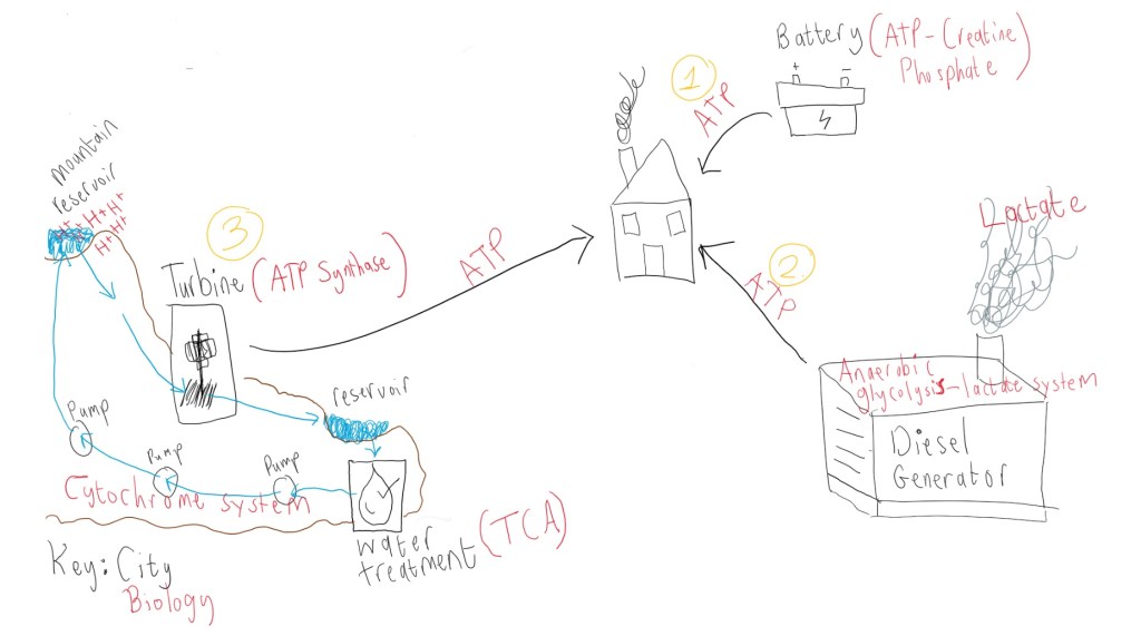 Now, imagine if the Steenbras pump scheme could supply the majority of Cape Town’s energy needs during times of steady, long-term, sustainable demand. Sure, I’m aware that in reality, Steenbras functions more as a peak demand system than a base load system. But, hey, the very first word in the sentence asks you to “imagine,” so let’s not get bogged down in technicalities. This serves as a metaphor for our aerobic respiration system.